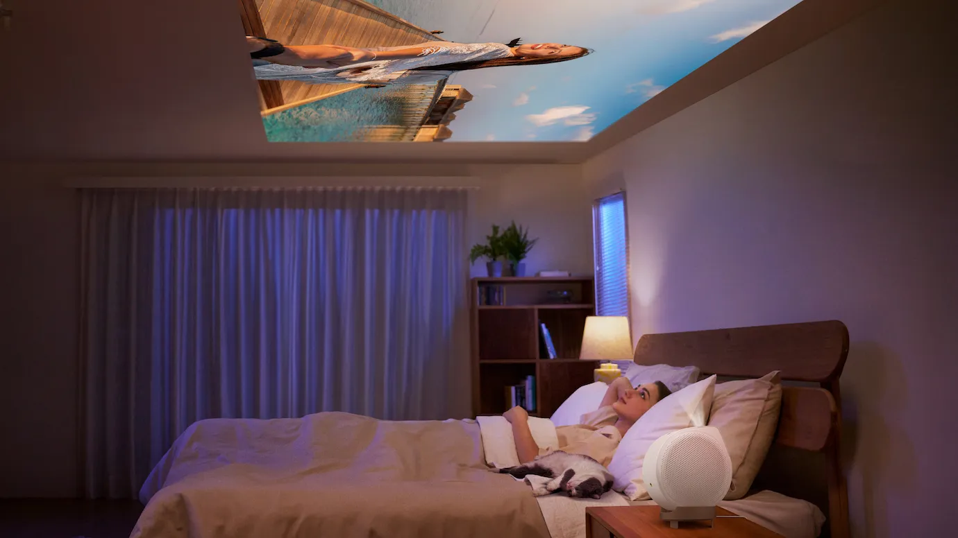 De echte kracht van BenQ GV32 is de ongeëvenaarde flexibiliteit, die het mogelijk maakt om vanuit elke positie van films te genieten. Het flexibele voetontwerp, geïnspireerd op een statief, maakt een beeldrotatie van 360° mogelijk. Projecteer films en series moeiteloos op het plafond terwijl u comfortabel in bed ligt. De beeldgrootte kan eenvoudig worden aangepast met de zoomhendel om obstakels aan het plafond te vermijden. De intelligente comfortfuncties zorgen voor maximaal comfort: de Night-Shift-beeldmodus past de kleuren automatisch aan om uw ogen te ontzien en u te helpen op natuurlijke wijze in slaap te vallen. Met de slaaptimer kunt u de beamer automatisch uitschakelen wanneer u dat wilt, zodat u volledig ontspannen in slaap kunt vallen. Met de afstandsbediening kunt u het beeld horizontaal en verticaal aanpassen, zodat u het beeld optimaal kunt afstemmen op uw ligpositie zonder de beamers te hoeven verplaatsen.